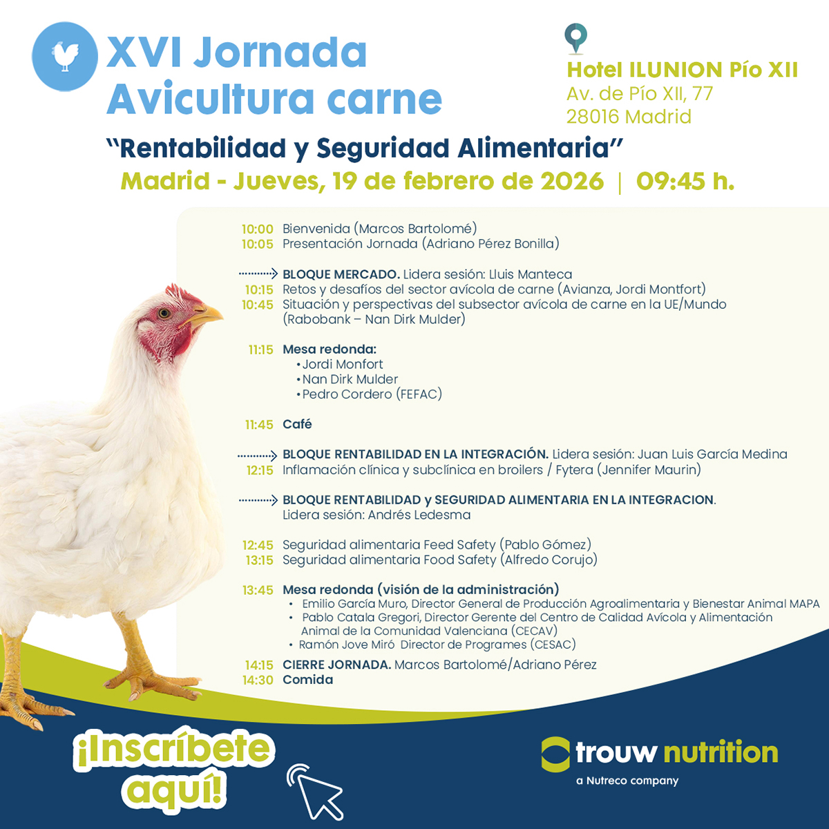 Inscripción XVI Jornada de Avicultura de Carne "RENTABILIDAD y SEGURIDAD ALIMENTARIA" 19 de febrero de 2026 Hotel Ilunión Pio XIIAv. de Pío XII, 77 · 28016 Madrid Descargar programa